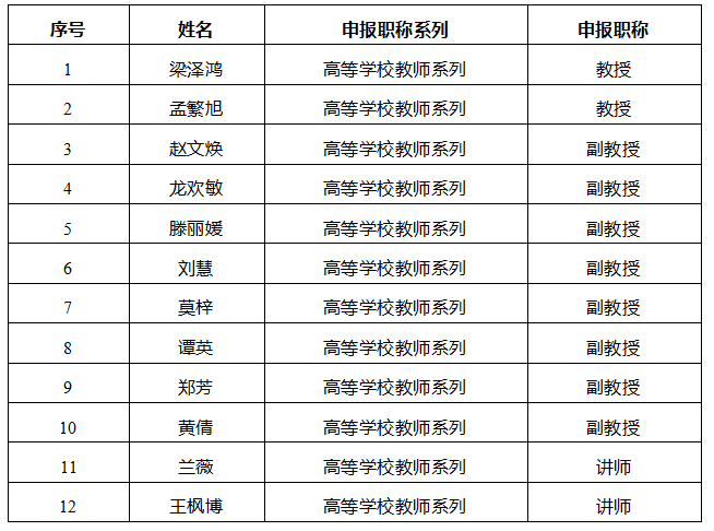 根据学校职称工作安排,学校职称审议推荐小组于2025年10月10日对申报职称人员的政治思想表现、职业道德、学历资历、专业工作经历(能力)、业绩成果等材料进行了审议。其中孟繁旭等12位同志满足本人所申报的职称评审条件,予以推荐。为充分体现“公开、公平、公正”的原则,现将审核推荐结果及个人申报材料予以公示,公示期从2025年10月14日至10月20日,材料公示地点为04313。如对所公示的人员有异议,请于2025年10月20日17:00前以书面方式向学校职改办或学校纪委反映,书面材料请签署本人真实姓名并附联系方式。真实反映意见者受国家法律保护(根据文件规定,匿名意见不予受理)。电话:0773-3692655。