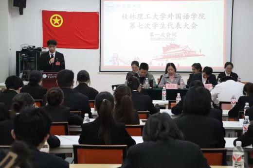 为凝聚青春奋进力量,推动学生组织创新发展,2024年11月14日晚,桂林理工大学外国语学院第七次学生代表大会在雁山校区15栋205教室隆重举行。学院党委副书记邓洁琼老师、团委书记舒强老师、校学生会主席团成员受邀出席,63名学生代表齐聚一堂,共同参与这场年度盛会。会议由英语21-6班韦俊文同学主持。