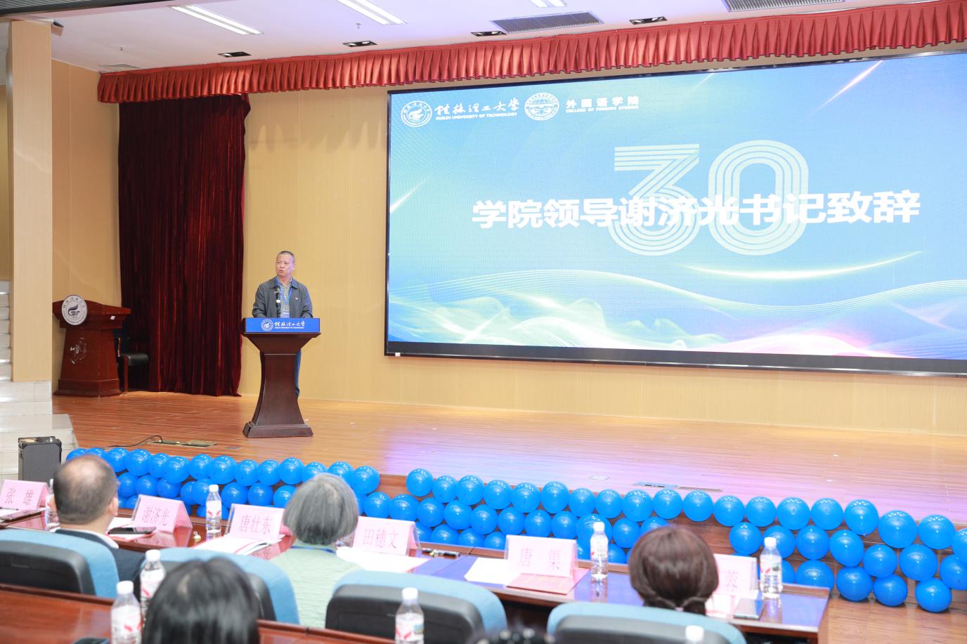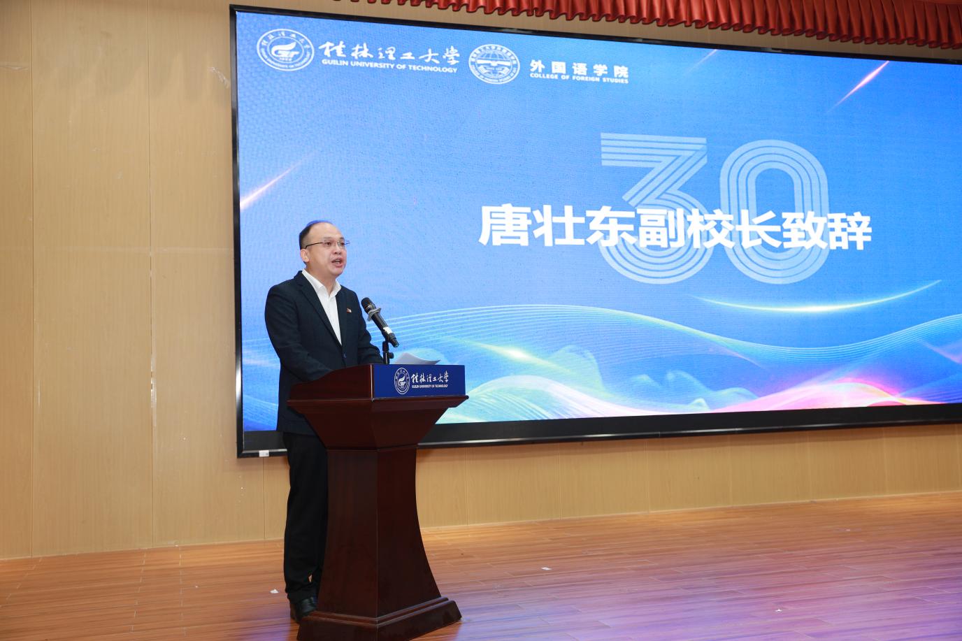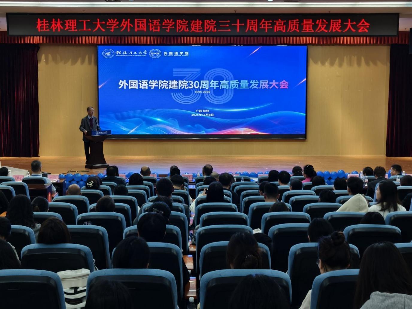 金风送爽,硕果盈枝。2025年11月8日,桂林理工大学外国语学院建院30周年高质量发展大会在雁山校区图书馆报告厅举行。学校党委常委、副校长唐壮东,学院党政领导班子、历任老领导、离退休老教师、校友代表以及在校师生代表200余人齐聚一堂,共庆学院三十华诞,共绘高质量发展新蓝图。会议由学院院长唐渠主持。