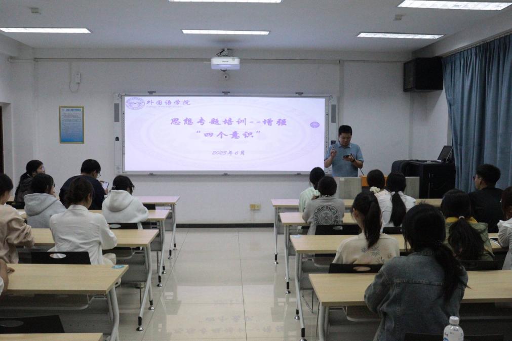 为深入学习贯彻习近平新时代中国特色社会主义思想,进一步巩固拓展主题教育成果,切实加强师生思想政治引领,2025年6月25日下午,外国语学院在雁山校区04305教室组织开展了“增强‘四个意识’”思想主题团课。本次团课由学院青年讲师团讲师、学院团委书记舒强老师主讲。