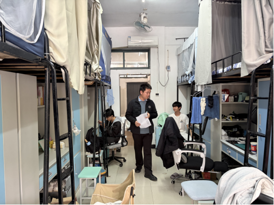 走访过程中,辅导员们分组行动,逐层逐间检查宿舍内务卫生、用电安全、消防安全等情况,重点排查违规电器使用、私拉电线、易燃杂物堆积等安全隐患,并现场记录问题、督促整改。同时,辅导员们走进一站式社区活动空间,了解学生日常活动开展情况,检查场地设施安全性,确保学生课外活动安全有序。