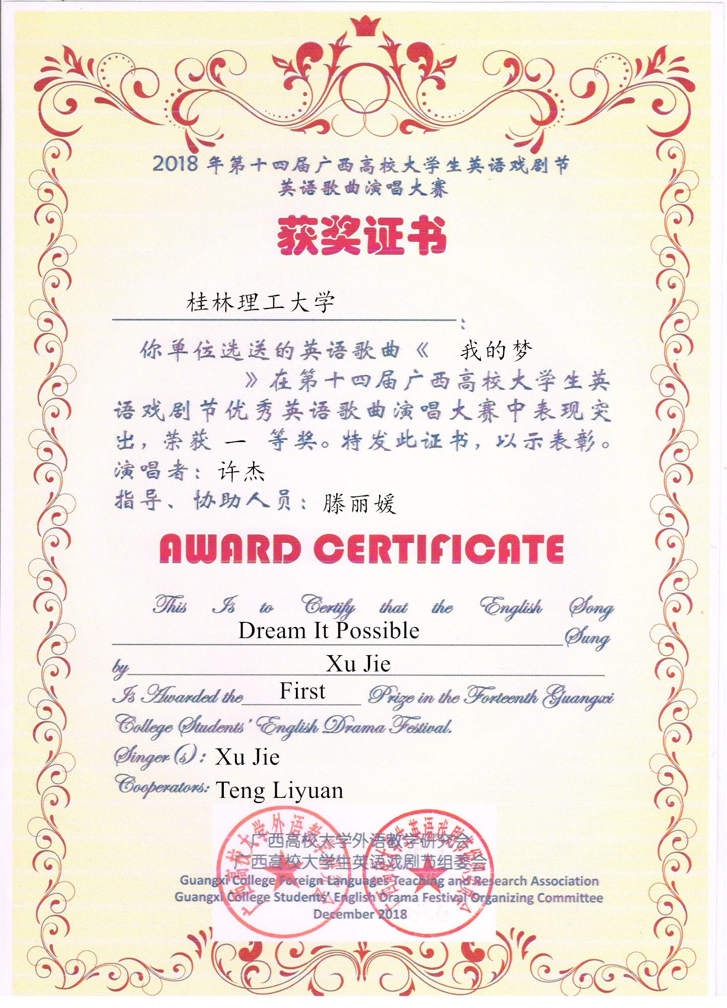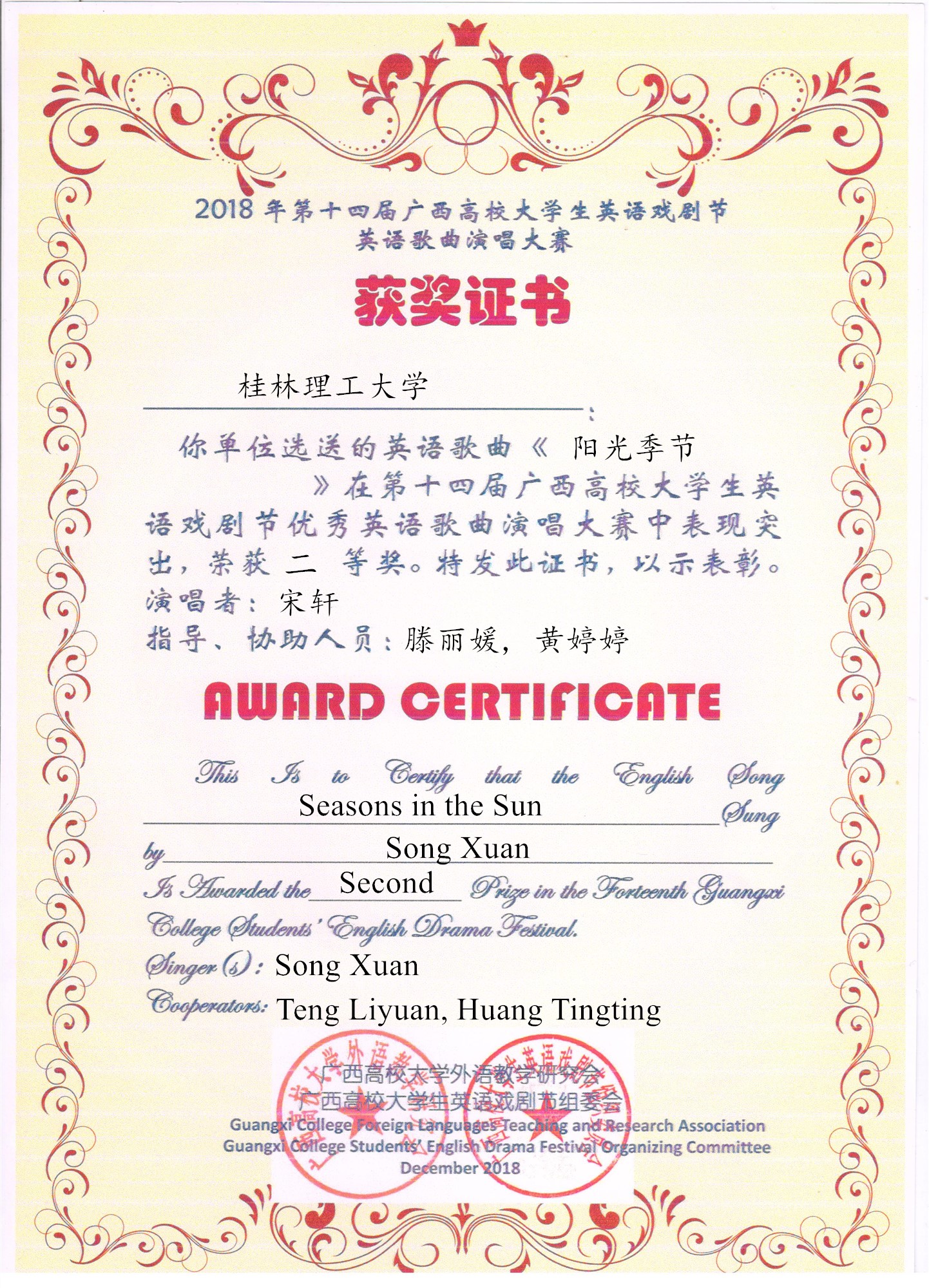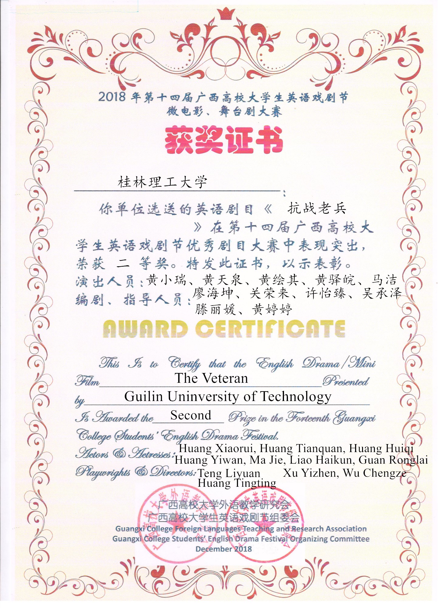 日前,第十四届广西高校大学生英语戏剧节决赛结果揭晓,由我校选送的舞台剧作品《抗战老兵》(The Veteran)荣获微电影、舞台剧组二等奖;另外我校选送的学生作品《我的梦》(Dream It Possible)和《阳光季节》(Seasons in the Sun)分别荣获英语歌曲演唱组一等奖和二等奖。