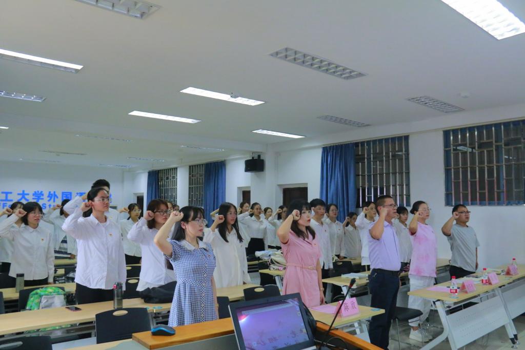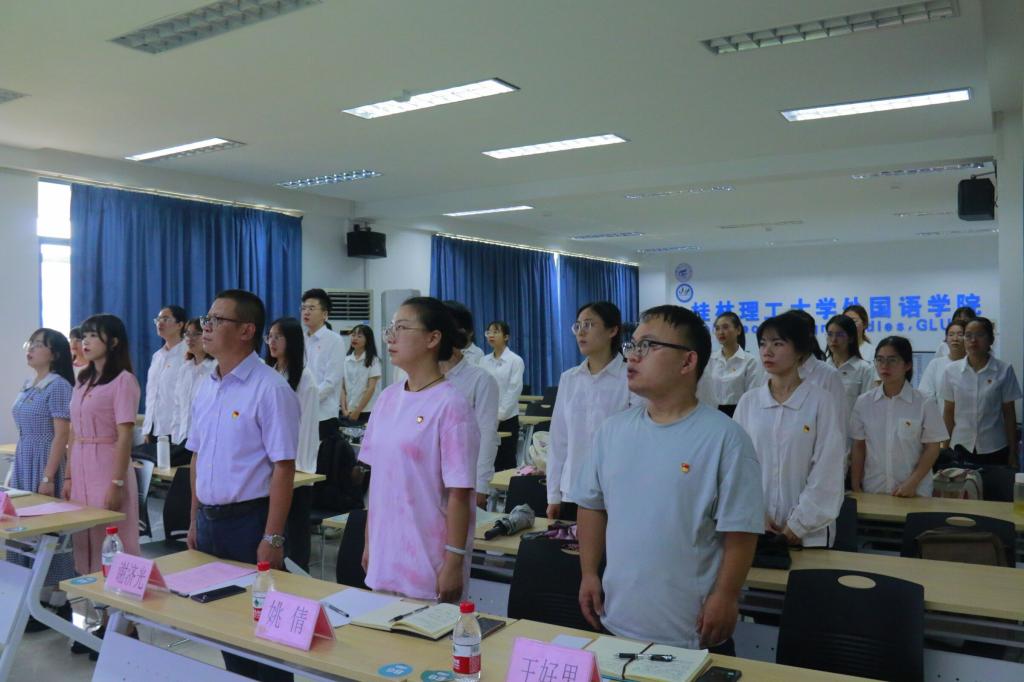 为加强预备党员的党性教育,提升预备党员对中国共产党政治事业的认同感和责任感,更好引导预备党员坚定理想信仰,牢记初心使命。2021年9月22日,桂林理工大学外国语学院在雁山校区04305举行预备党员入党宣誓大会。本次大会由学院专职组织员、纪委委员陈欣同志主持,参加此次宣誓大会的有外国语学院党委书记谢济光同志、研究生党支部书记王好男同志、学生第二党支部书记李林军同志、学生第三党支部书记姚倩同志,以及外国语学院全体预备党员。