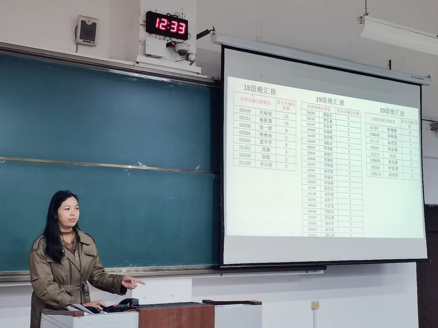 首先,姚倩老师通报了9月份各年级宿舍内务的总体情况、每日未按时确认群公告的宿舍晚汇报情况以及近期校级宿舍检查中存在的违规情况。接着,邓洁琼老师讲话,她强调了宿舍晚汇报、禁止使用违规电器等管理制度,并鼓励宿舍长与宿舍成员齐心协力,共同打造安全、良好的宿舍环境。最后,邓洁琼老师积极引导同学们提高自我防范意识,经常自检自查,自觉做好宿舍日常安全隐患排查。