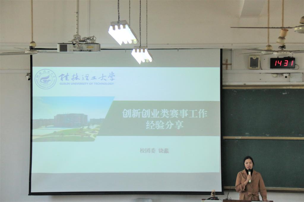 2021年10月26日下午,我院在我校雁山校区6栋409教室顺利召开了“大学生创新创业与科技竞赛的三大备赛”讲座。校团委副书记饶蠡受邀作为主讲人参与本次讲座。学院党委副书记邓洁琼、学院院长唐渠、学院副院长李蓉、团委副书记黎云鹏、辅导员王好男出席讲座,我院师生300余人到场参加此次讲座。