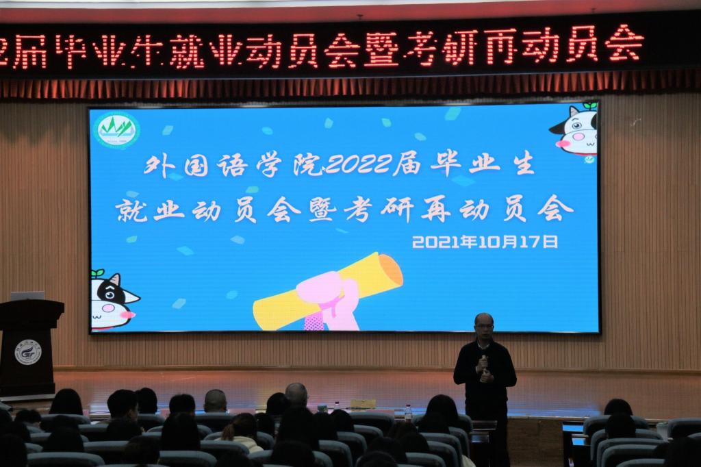 2021年10月17日晚,我院在雁山校区图书馆报告厅召开2022届毕业生就业动员会暨考研再动员会。学院党委书记谢济光、学院院长唐渠、学院副院长朱建斌、学院院长助理曾文华出席本次动员大会。2022届全体毕业生270余人到场参加大会。会议由学院团委兼副书记、2022届毕业生辅导员梁璇主持本次大会。