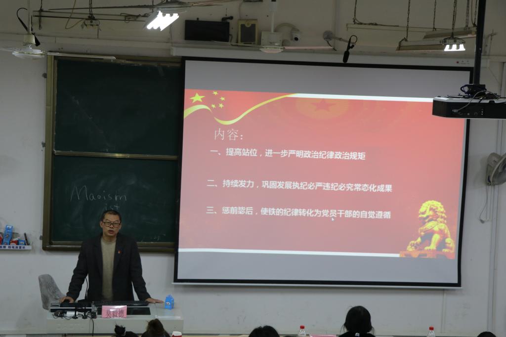 培训开始,谢济光书记带领全体党员重温了我们党在斗争中成长直至取得新民主主义革命胜利的艰辛历程,使全体党员对于中国共产党的历史有了更为深刻的理解,更值得一提的是,谢书记用中英双语为党员授课,既加强了对专业知识的学习,又加深了对理论知识的理解。接下来,日语教研室主任邓圆同志用日语向全体党员解读了第十三届全国代表大会第四次政府工作报告。通过梳理报告中的关键词和数字,全体党员明白了政府工作贴近民生、贴进实际,体会到了党的务实作风。接着,学院纪委委员莫毅德同志作了关中国共产党纪律处分条例的专题报告,用身边党员违反纪律的案例使全体党员明白了党的纪律的重要性。它是维护党的团结统一的有力武器,是保持党的先进性和纯洁性的重要条件,是党的路线、方针、政策得以实现的重要保证,对于增强党的凝聚力和战斗力,密切党同人民群众的血肉联系具有十分重要的作用,每位党员都必须躬身践行。通过此次学习,相信党员们已经深刻地感受到在全面从严治党的新形势下,加强党的纪律建设的重要性。