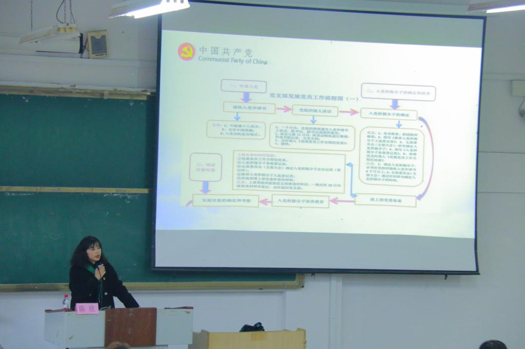 课上,学院专职组织员、纪委委员陈欣老师就“申请入党必须准备的材料及其撰写方法”进行授课,从党员发展基本流程介绍和申请入党相关材料的撰写方法两个方面说明。首先,她介绍了党支部发展党员工作流程图,直观生动的展示了入党流程步骤。接着,陈欣老师向入党积极分子们讲授申请入党需要准备入党申请书、思想汇报等材料,并对其注意事项和书写格式重点说明。最后,她通过参考例文让大家加深记忆,引导其正确撰写。