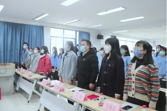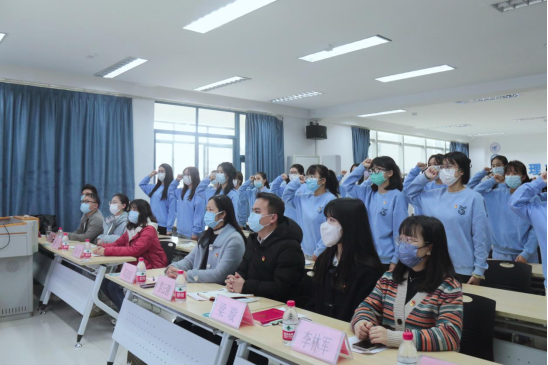 紧接着,伴奏声响起,全体师生起立并高唱起《光荣吧,中国共青团》;随后,英语2021-5班团支部书记带领支部全体团员重温了入团誓词,嘹亮的歌声和宣誓声响彻现场,也代表着青春希望的力量。