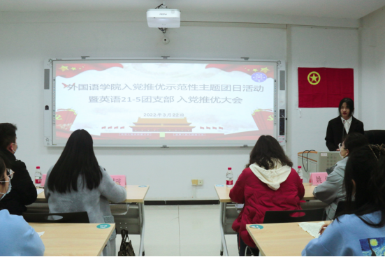 为规范学院各团支部开展优秀团员入党推优工作,扣好优秀团员入党第一颗纽扣,3月22日下午,我院团委在04305会议室举办我院入党推优示范性主题团日活动。学院党委副书记邓洁琼、学院团委副书记(主持工作)黎云鹏、学院党建组织员陈欣、学院团委副书记兼18级辅导员梁璇、19级辅导员姚倩、20级辅导员李林军和王好男、英语21-5班班主任王枫博出席本次活动。学院学生党员代表、各班团支书、团委组织部工作人员、英语2021-5班团支部全体团员和群众参加本次活动。