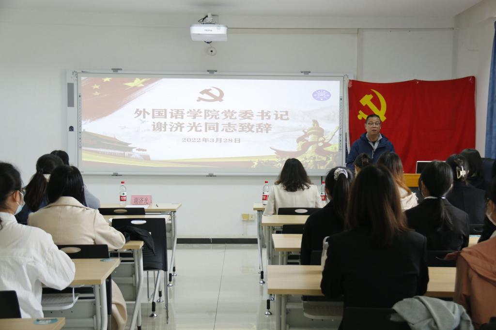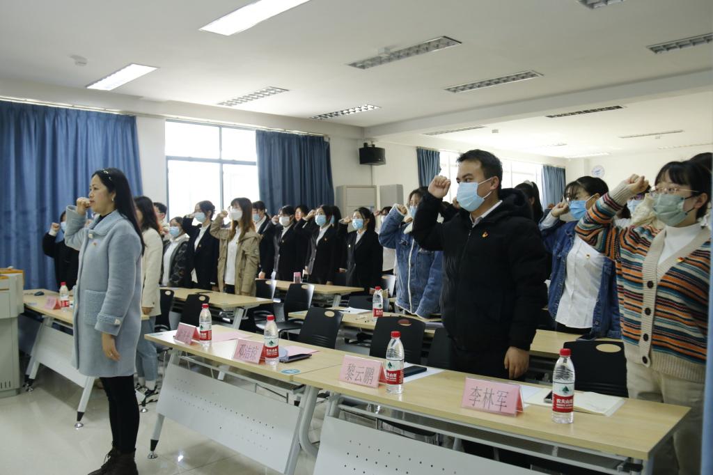 为切实提高预备党员发展质量和党性修养,强化党员意识,更好地引导预备党员坚定理想信念、牢记初心使命,我院于2022年3月28日在雁山校区04305召开了外国语学院2021年秋季学期预备党员入党宣誓大会。本次大会由专职组织员、纪委委员陈欣同志主持,参加此次大会的有学院党委书记谢济光同志、学院党委副书记及本科生第一党支部书记邓洁琼同志、本科生第四党支部书记李林军同志、本科生第三党支部书记姚倩同志、党委委员及本科生第二党支部书记黎云鹏同志、以及外国语学院2021年秋季学期新发展预备党员。