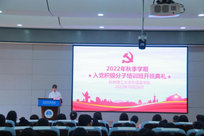 为进一步提高入党积极分子对党的认识,明确入党目的,端正入党动机,我院于2022年10月26日在雁山校区01501报告厅举办了外国语学院2022年秋季学期入党积极分子培训班开班典礼。出席本次开班典礼的领导和嘉宾有:学院党校校长、党委书记谢济光同志,学院党校副校长、党委副书记邓洁琼同志,学院党委委员、本科生第二党支部书记黎云鹏同志,本科生第三党支部书记姚倩同志,本科生第四党支部书记李林军同志,研究生党支部书记王好男同志。本次开班典礼由学院党建组织员陈欣同志主持,2022年秋季学期入党积极分子参加。
