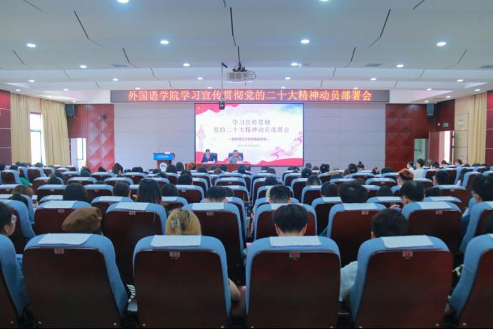 为深入学习贯彻党的二十大精神,切实将学院广大师生的思想和行动统一到党的二十大精神上来,桂林理工大学外国语学院于2022年10月26日中午在雁山校区01501报告厅召开了学习宣传贯彻党的二十大精神动员部署会。学院党委书记谢济光同志,学院党委副书记、纪委书记邓洁琼同志,学院党委委员、副院长朱建斌同志,以及学院党委委员、纪委委员、各党支部书记出席会议,学院全体党员、各班班长及各学生社团组织负责人到场参加。本次动员部署会由学院党建组织员陈欣同志主持。