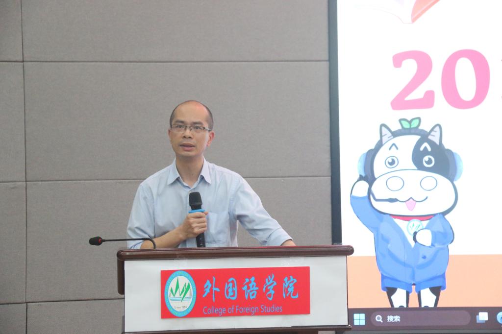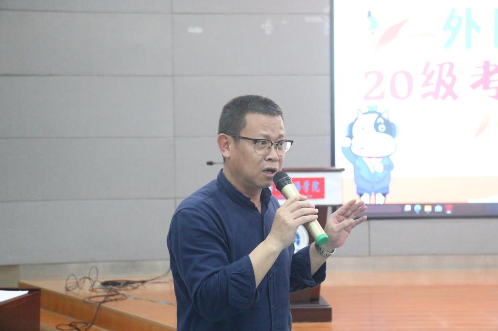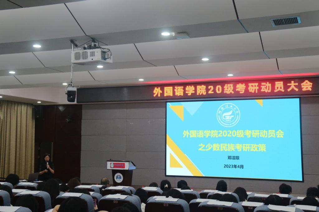 首先,学院副院长朱建斌作考研动员大会主题发言。朱老师以考研报考和备考为题,向同学们面面俱到传授考研经验与方法,提醒同学们考研之路贵在坚持。接着学院院长助理曾文华为日语专业的同学分享了留学与跨考的经验。随后学院英语教研室教师冯雪琦向同学们分享了自身出国深造的经历,激发了同学们的学习热情。学院党委副书记邓洁琼老师和同学们介绍了少数民族政策和少干计划。之后,三位2019级考研上岸的学长学姐结合切身经历向同学们分享了考研的宝贵经验。英语2019-6班周小华同学分享了考研复习经验与学习经验,推荐了许多学习资料网站。英语2019-1班吴吉林在轻松幽默的气氛中向同学们讲述了他的备考经历,提醒同学们在备考期间注意对考研信息的获取,弥补信息差。日语2019-1班罗柳怡鼓励同学们调整好心态,不要焦虑,重视对学校的选择。会议最后,学院党委书记谢济光对老师、同学们的经验分享表示感谢,并对考研同学寄予厚望。