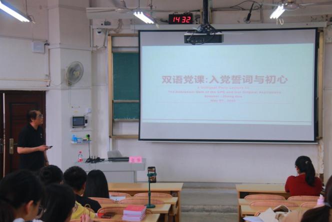 为激励同志们坚定共产主义理想,进一步增强党性观念,强化责任担当,我院于2023年5月5日下午在雁山校区04324教室举办了《入党誓词与初心》“双语”党课。本次“双语”党课由学院党委委员张华同志主讲,党建组织员陈欣同志主持,学院全体学生党员、党务干部及新发展对象积极参与了本次双语党课。