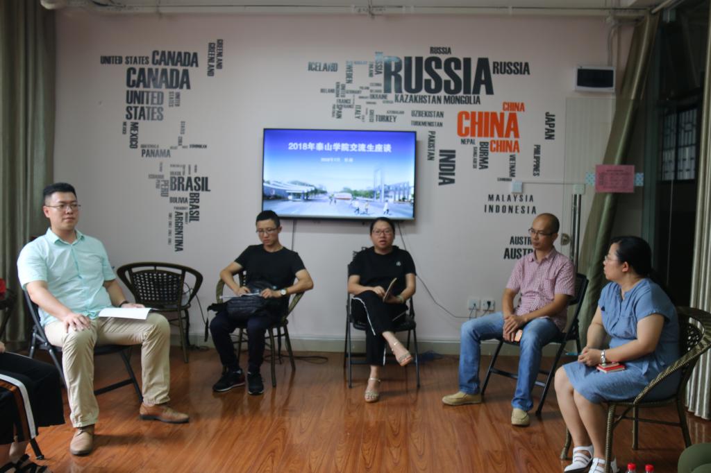 7月3日中午,我院于我校雁山校区四栋教学楼外国语学院大学生活动中心举办泰山学院交换生座谈会,学院党委副书记江玲、院长助理曾文华、团委书记钟立军、日语教研室主任覃霄、英语教研室副主任彭奉天以及8位交换生了参加本次交流会。